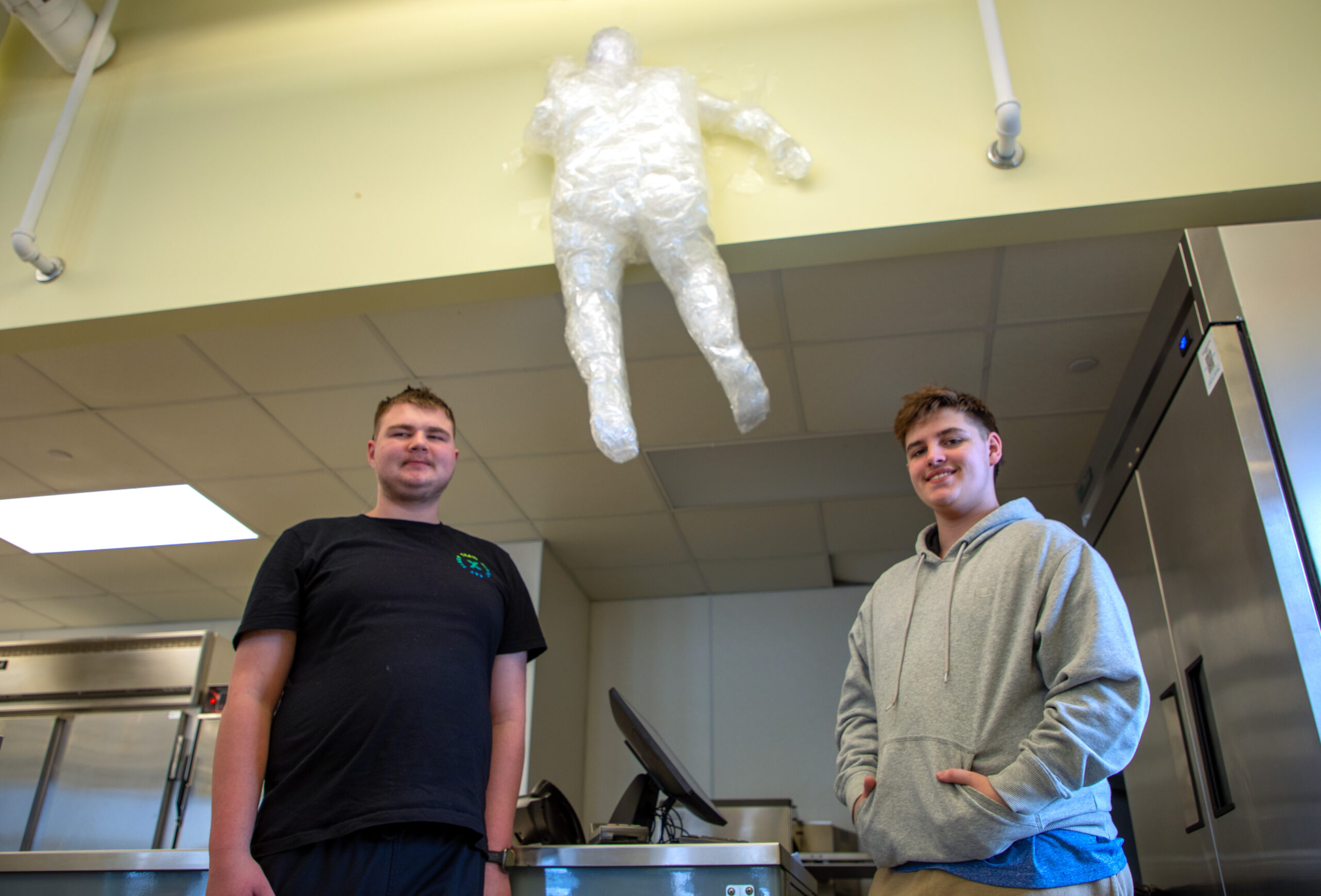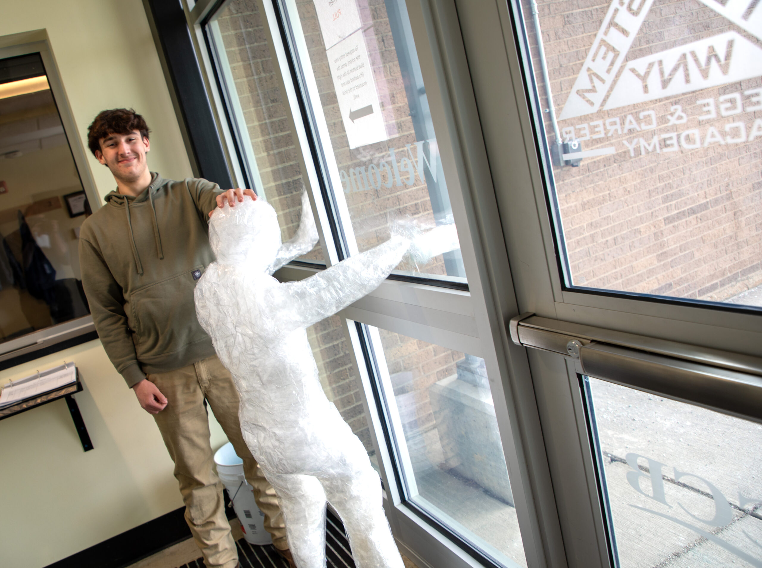 Placed nearby is a figure climbing up the cafeteria wall made by Jonathan Pilski of Silver Creek and Wesley Barger of Westfield.