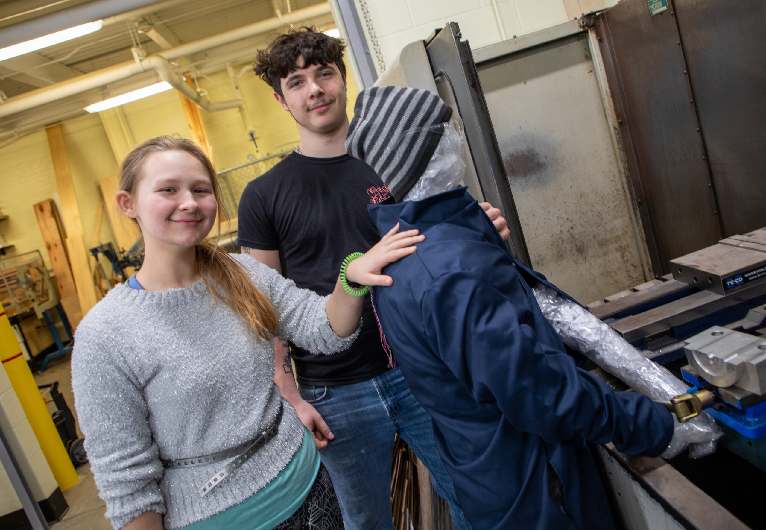 In the Mechanical Technology classroom is a sculpture by Tiahjae Perez of Jamestown and Myah Benjamin of Dunkirk. The figure, propped up to appear to be working, is fully dressed in shoes, jeans, a jacket, and a hat.