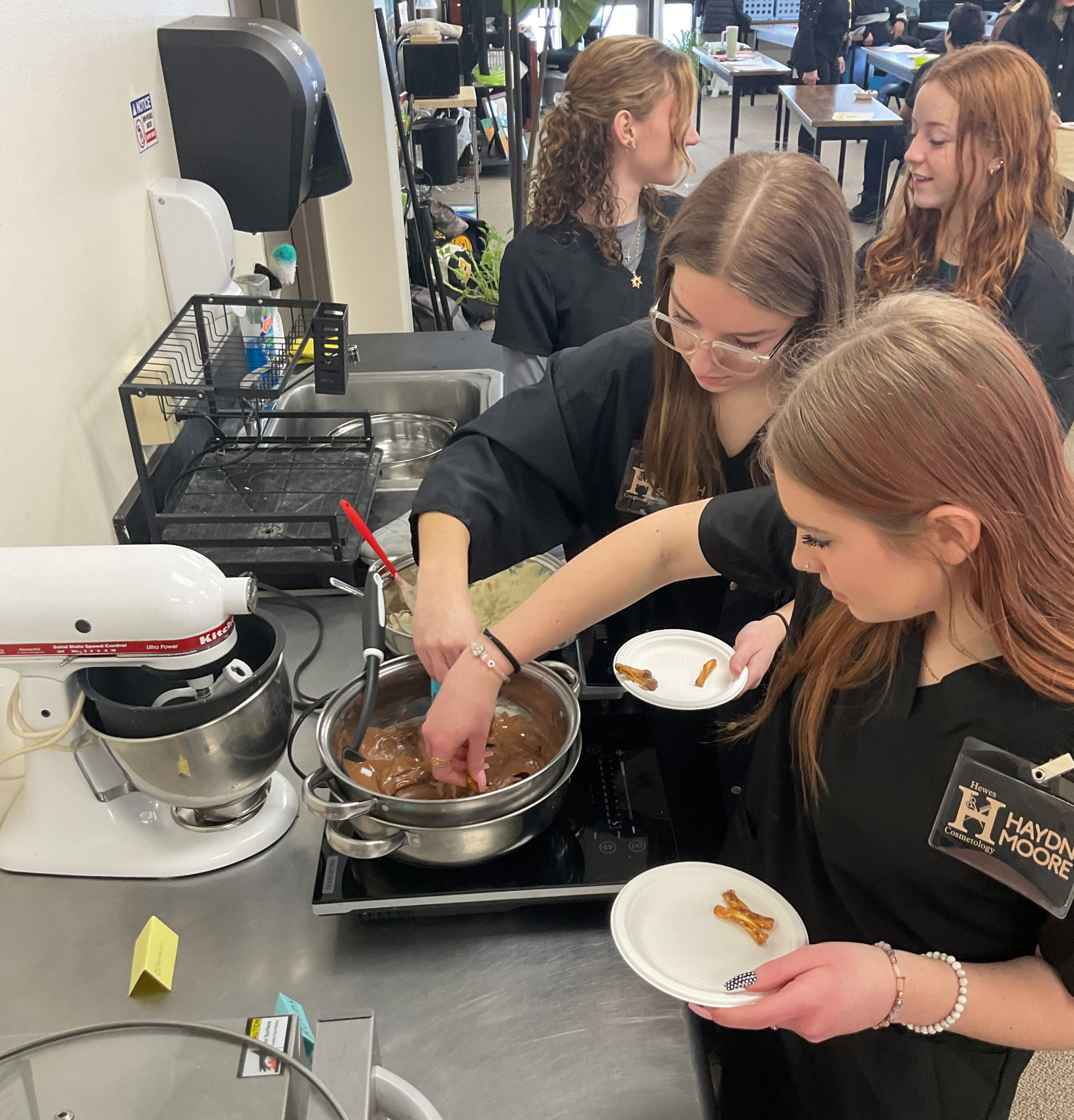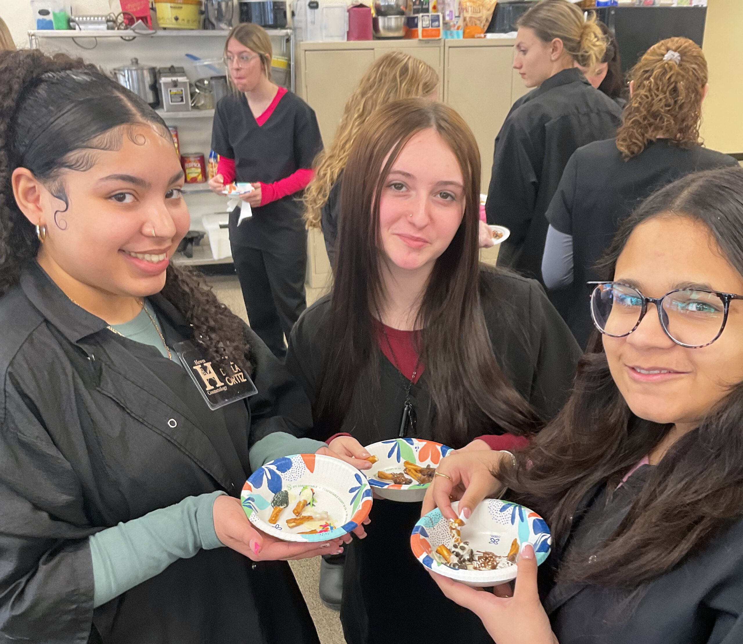 Later in the week, the partnership continued when Asel’s class welcomed the Cosmetology group into their classroom for a creative review of hair shaft anatomy — with a fun and tasty twist.
