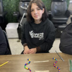 The lesson began when Christie Asel’s Career & Technical Explorations class visited the Cosmetology program, working alongside instructors Kara Rusco and Kyla Rodriguez. Using colorful pop beads to represent amino acids and peptide bonds, the group constructed polypeptide chains in a helical shape.